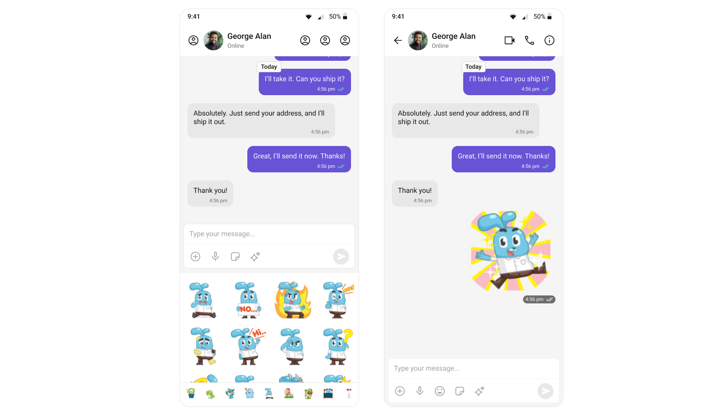 The Stickers extension allows users to express their emotions more creatively. It adds a much-needed fun element to the chat by allowing users to send various pre-designed stickers. For a comprehensive understanding and guide on implementing and using the Sticker Extension, refer to our specific guide on the Sticker Extension. Once you have successfully activated the Sticker Extension from your CometChat Dashboard, the feature will automatically be incorporated into the Message Composer component of UI Kits.
