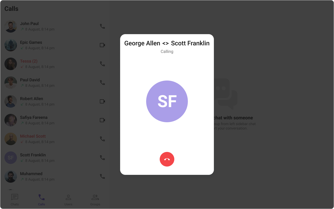 This prop renders the custom cancel-call button view for the outgoing call. Use this to override the existing cancel call button view from the outgoing call. The customized chat interface is displayed below.